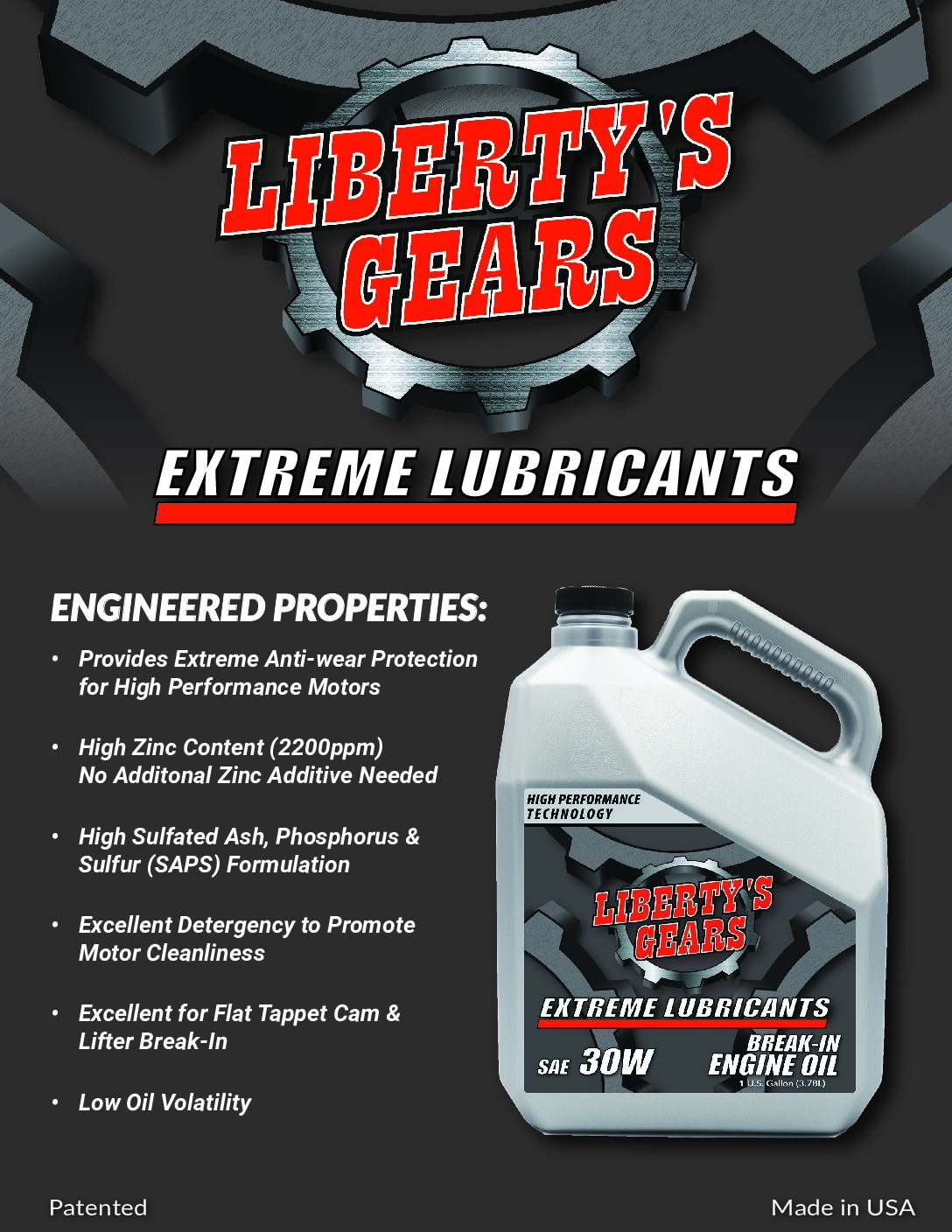 Liberty’s Gears® Extreme Break-In 30W Engine Oil is an exclusive formula designed to provide critical protection to high performance motors during the engine break in period. Liberty’s Gears® Extreme Break-In 30W Engine Oil utilizes conventional petroleum base stocks which are more compatible than synthetic oils on engine seals which helps encourage the seals and gaskets to operate as designed. This proprietary blend of high quality performance additives provides extreme anti-wear protection, a high sulfated ash, phosphorus & sulfur (SAPS) formulation, with excellent detergency to promote engine cleanliness, and low oil volatility for high performance engine applications.