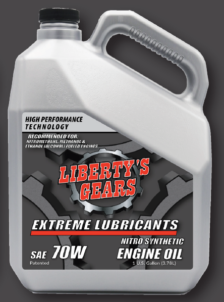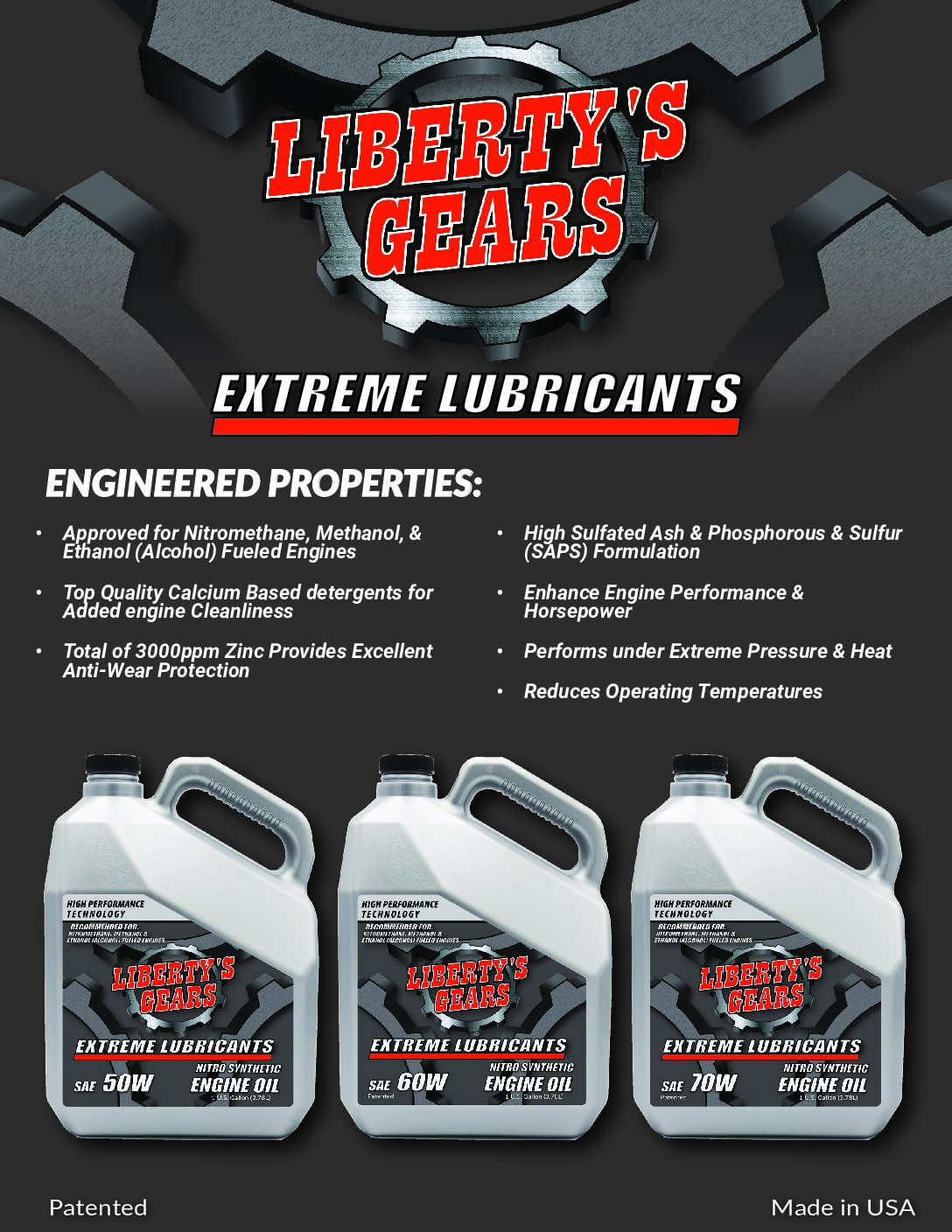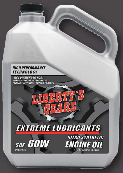 Applications: Liberty’s Gears® Extreme Nitro Synthetic Engine Oil is recommended for high performance Nitromethane, Methanol and Ethanol (Alcohol) burning engines where exceptional engine protection is needed. Liberty’s Gears® Extreme Nitro Synthetic Engine Oil meets or exceeds API service SJ additive technology with additional performance additives. Liberty’s Gears® Extreme Nitro Synthetic Engine Oil is not for use in engines using catalytic converters as the concentrated additive formulation will damage emission components.